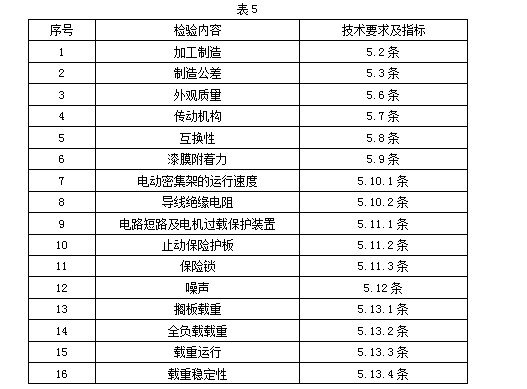 之二。型式檢驗的項目,手動密集架按表5中序號1~6、13~16的內容進行,電動密集架按表5中所列全部內容進行。