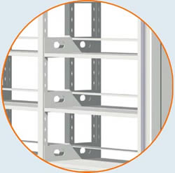 | 基座整體焊接合拼,架體為三柱插入結構,節與節之間用掛板分隔,立柱中開有掛孔,掛板扣掛于立柱的掛孔上,擱板放置于掛板下沿折彎上且扣牢在掛板的孔扣上;每層擱板一分為二,擱板間距可上下調節。每節雙面間以分隔棒隔開。這種密集架一般適于架體厚度較大的密集架,如密集架厚度超過600mm的一般都要采用三立柱型。